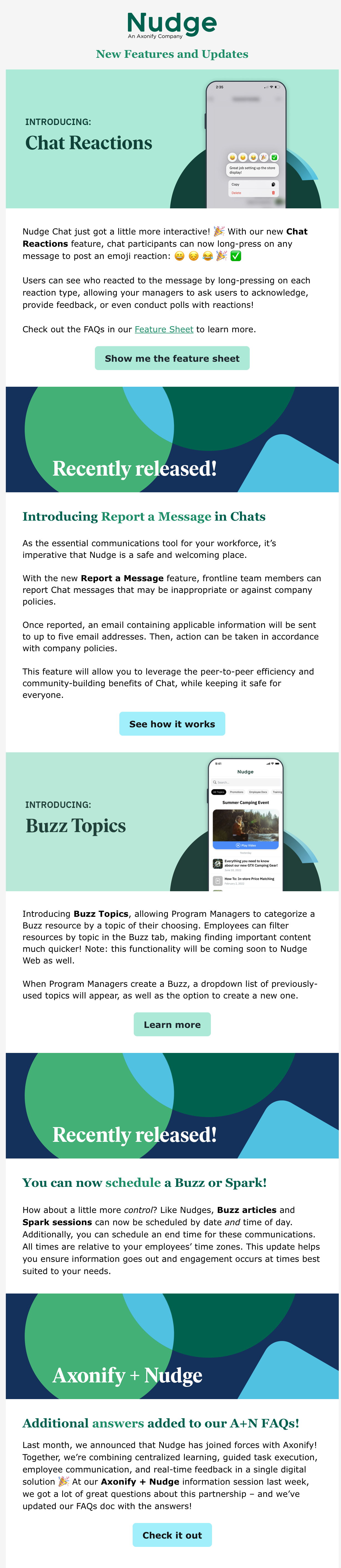Nudge product emailOne of many emails to Nudge customers explaining the latest feature releases and updates.